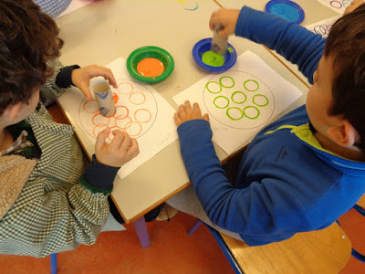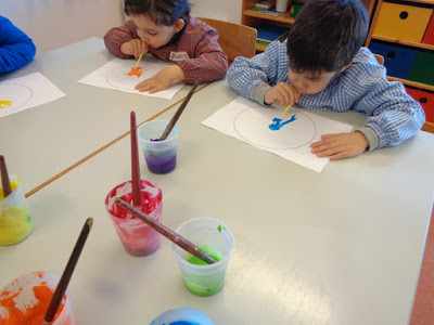 Continuámos a explorar novas técnicas de pintura e a figura geométrica - círculo.